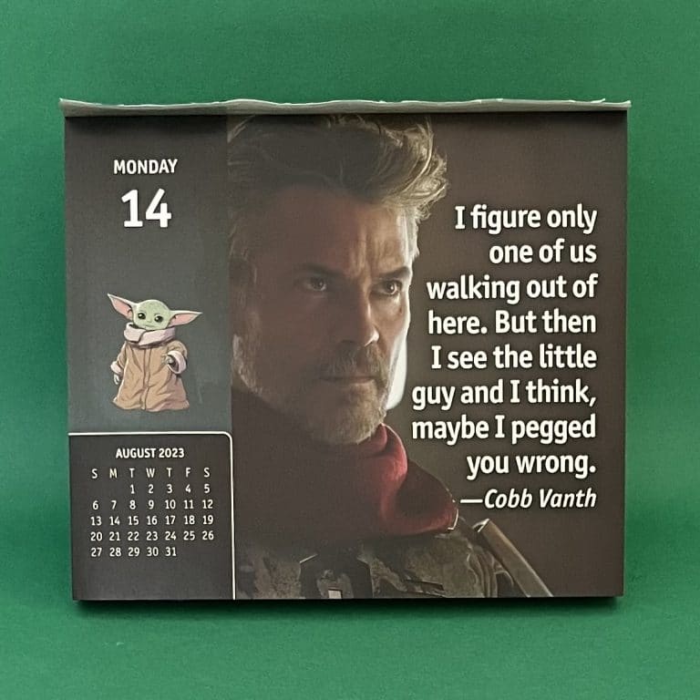 8月14日 月曜日 台風が心配ですね〜🌀 十分に備えをしなければですね。 マンダロリアン日めくりカレンダー🗓️ 本日は、コブ・ヴァンスのこのお言葉です。 「I figure only one of us walking out of here. But then I see the littl... -